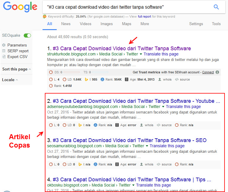 Misalnya aku ingin menemukan blog yang sudah menduplikasi salah satu artikel blog saya yang memiliki dengan judul #3 cara cepat download video dari twitter tanpa software, maka caranya yaitu sebagai berikut: