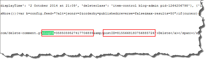 Untuk menerima BlogID caranya sangat mudah, pada halaman Source arahan, lakukan pencarian dengan menekan tombol CTRL+F kemudian cari text BlogID atau dengan text PostID, anda akan menemukan beberapa text BlogID dan postID, anda mampu saja sekaligus menemukan keduanya seperti gambar di bawah ini: