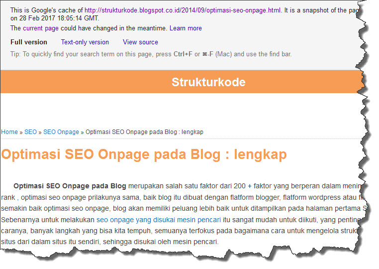 Jika web cached untuk artikel blog anda belum dihapus oleh mesin pencari google, maka akan tampil cached halaman blog anda mirip gambar di bawah ini: