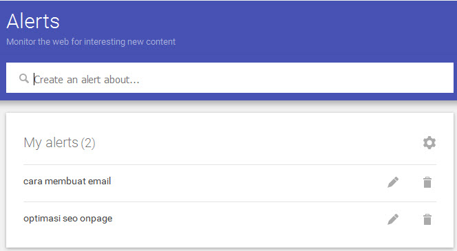 Anda bisa memasukan beberapa kata kunci relevan dengan blog anda pada kotak isian “Create an alert about….” anda mampu menekan enter untuk melihat blog-blog yang mempunyai artikel dengan kata kunci tersebut, atau tekan tombol create Alert, untuk menyimpan kata kunci tersebut.