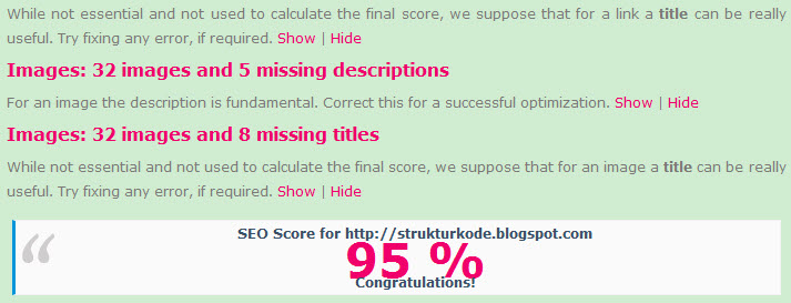 Nilai seo tool menggunakan chkme sangat dipengaruhi oleh postingan anda, terutama gambar, jikalau template sudah mendukung seo tool versi chkme, maka saat memposting perhatikan juga optimasi gambar , pastikan untuk selalu menggunakan gambar yang dikompress supaya ukurannya lebih kecil, menambahkan atribut title dan alt tag juga jangan hingga lupa, jikalau tidak maka seo score versi chkme akan menurun.