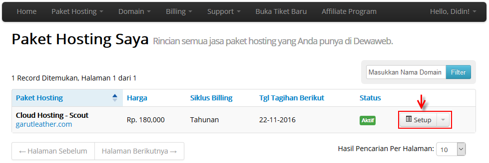 Anda akan melihat daftar domain anda silahkan anda kliktombol setup pada domain aktif anda, mirip terlihat pada gambar dibawah ini: