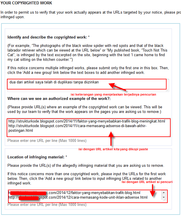 Kemudian isi juga data “Your copyrighted work” mirip terlihat pada gambar dibawah ini: