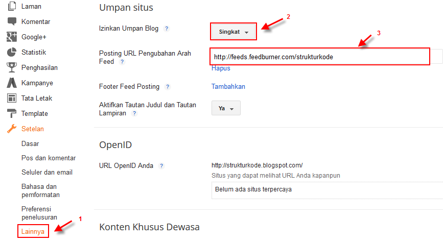 Pilih “Izinkan umpan blog” menjadi singkat, lalu “Posting URL pengubah Arah Feed” anda isikan dengan url feed burner anda yang sudah anda kopikan pada notepad di tahap sebelumnya, silahkan paste pada kotak no 3 seperti gambar diatas.