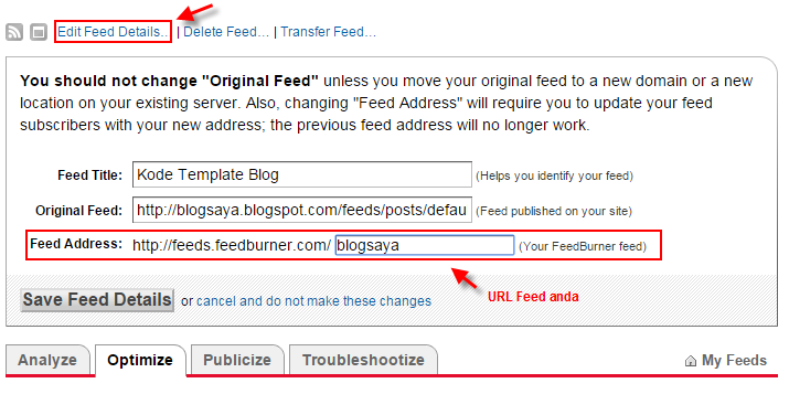 h. Lihat ke pojok kanan kiri atas, kemudian silahkan pilih dan klik “Edit feed detail…”, untuk melihat alamat feedburner untuk anda tempel di blog anda, terlihat mirip gambar berikut ini: