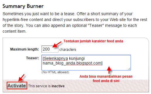 g. Seperti terlihat pada gambar diatas, silahkan tentukan jumlah aksara untuk rss feed anda, lalu anda juga bisa menambahkan pesan untuk feed anda, jika sudah tekan tombol “Activate”