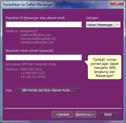 ID Messengger mampu anda minta ke sobat YM anda, kemudian masukan, kalau perlu masukan no telepon juga biar anda bisa mengirim pesan SMS ke HP sobat YM Anda, jikalau sudah silahkan tekan tombol berikutnya >