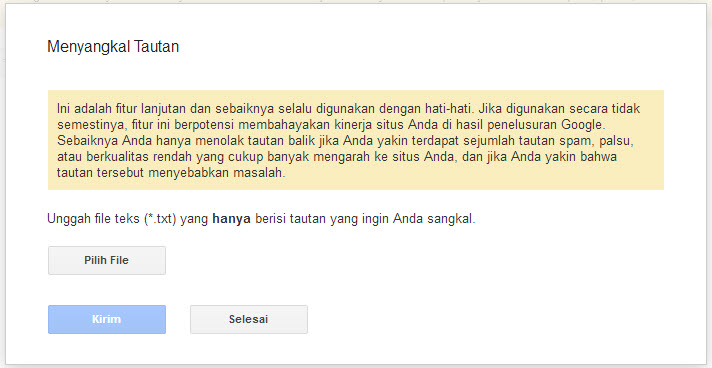 Untuk mengatasi masalah tersebut google menyediakan tool khusus yang berjulukan google disavow tool, dengan tool ini anda mampu menawarkan informasi kepada mesin pencari google untuk tidak menganggap link-link yang bersumber dari blog-blog yang tidak kita harapkan yang justur dapat memperburuk kualitas seo blog kita, alasannya kalau backlink tersebut dibiarkan kemungkinan akan memperburuk kualitas seo blog kita, menurukan traffik dan yang paling parah jikalau blog sudah terkenda dampaknya maka blog akan sulit untuk recovery.
