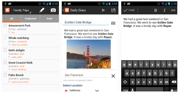 Dengan aplikasi blogger anda juga mampu menulis artikel postingan blog anda dengan menggunakan hp. Aplikasi ini cukup membantu manakala anda ingin menulis artikel postingan sementara anda tidak sedang di depan komputer.