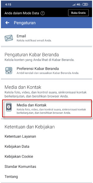 4. Di halaman pengaturan, scroll ke bawah kemudian pilih hidangan Media dan kontak