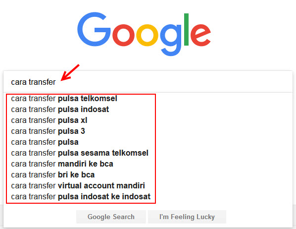 Dengan ide kata kunci “cara transfer”, ternyata ada aneka macam kata kunci yang sering digunakan orang untuk melakukan pencarian, dari data google auto suggestion tersebut silahkan anda ambil satu kata kunci untuk anda kembangkan, dan jangan lupa catat kata kunci relevan lainnya untuk lsi keyword yang bisa anda sisipkan di artikel blog yang akan anda buat.