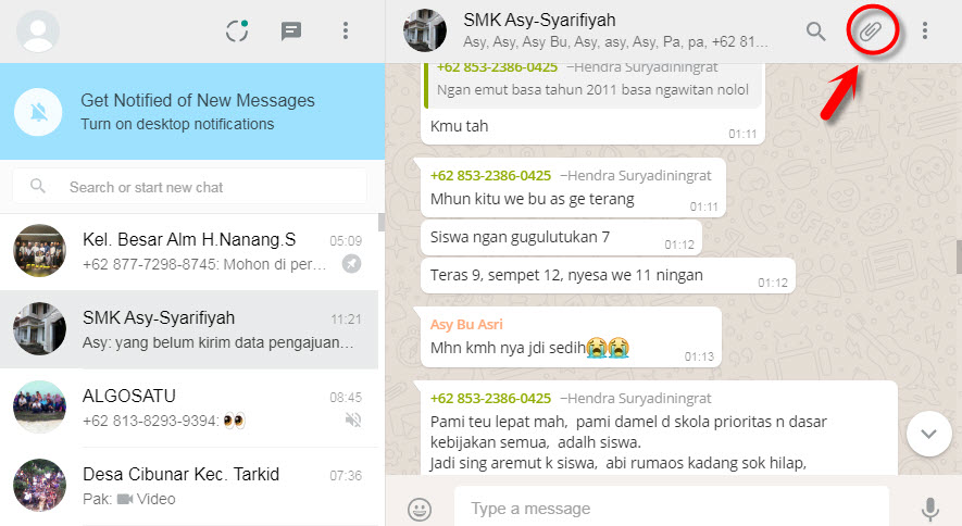 Setelah terbuka, klik tombol bergambar peniti di pojok kanan atas untuk mulai memasukan dan mengirim file / data atau dokumen melalui whatsapp.
