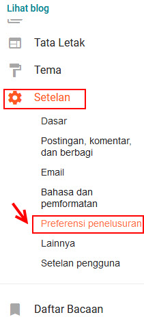 6. Kembali ke halaman akun blog anda, di bilah hidangan sisi kiri kini pilih menu setelan / settings > Search Reference / Preferensi penelusuran, terlihat mirip gambar di bawah ini: